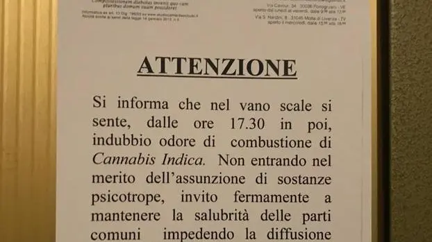 Dopo l’Epifania è apparso un cartello che recita così: «Nel vano scale si avverte dalle 17.30 in poi un indubbio odore di “cannabis indica”. Non entrando nel merito dell’assunzione di sostanze psicotrope, invito fermamente a mantenere la salubrità delle parti comuni, impedendo la diffusione degli effluvi. In mancanza, mi troverò nella necessaria condizione di richiedere ai carabinieri di indagare in merito».