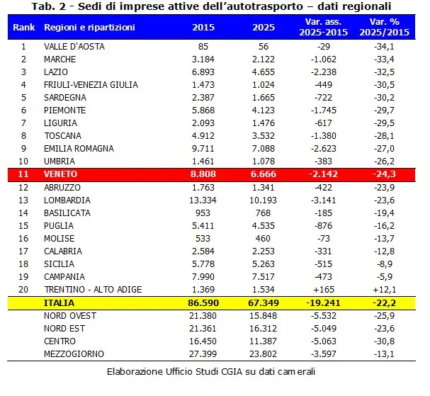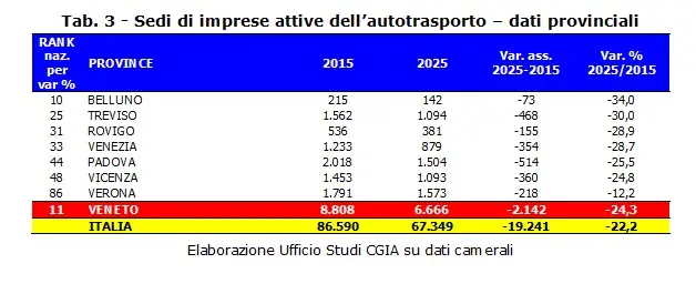 La crisi, in realtà, affonda le radici in un processo più lungo. Negli ultimi dieci anni il settore dell’autotrasporto in Veneto ha perso oltre 2.100 imprese, passando dalle 8.808 del 2015 alle 6.666 del 2025, con una contrazione del 24,3%, superiore alla media nazionale.