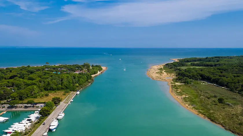 Una veduta dall’alto vista aerea del fiume Tagliamento tra Bibione e Lignano