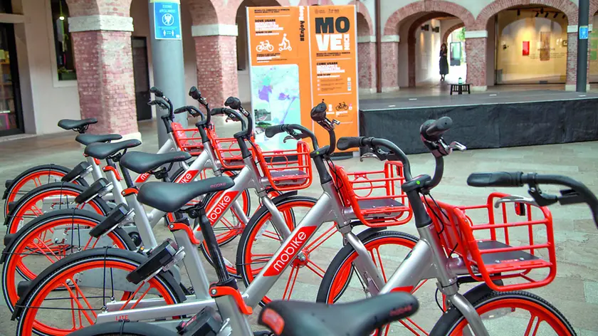 Nella foto grande le biciclette pubbliche in affitto a Mestre.