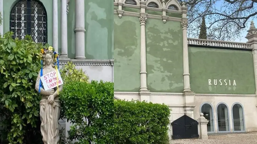 Una serie di opere d’arte sono state piazzate fuori dal padiglione della Russia. Il titolo: “Basta violentare l’Ucraina”. Identificate dalla polizia