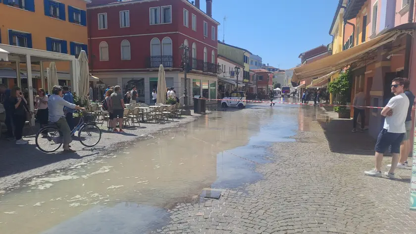 Scoppia una tubatura poco prima delle 12.30 di sabato 25 aprile a Caorle, in Rio Terrà, di fronte alla farmacia: caos nel pieno centro storico.