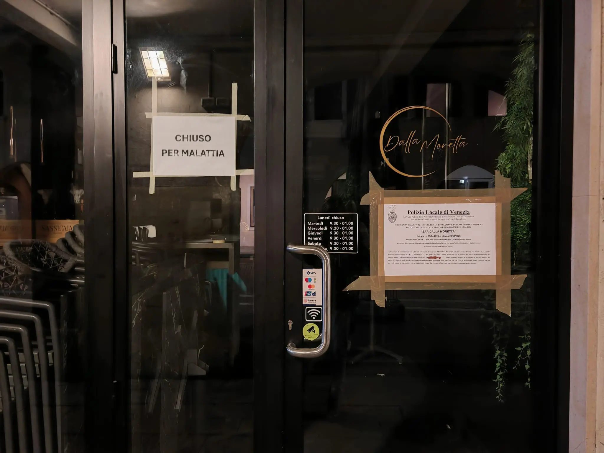 In pratica si poteva bere lo Spritz, ma con i carabinieri e i poliziotti a fianco. Alcuni locali hanno preferito chiudere presto. Un vero e proprio coprifuoco. Il bar Dalla Moretta, stante l'ordinanza, ha deciso di non aprire del tutto. A fianco al cartello in cui si vieta la chiusura oltre le 21, la scritta "Chiuso per malattia", appesa in forma che sa di protesta dalla titolare. Con il Dalla Moretta chiuso, la folla era certamente ridotta in via Palazzo.