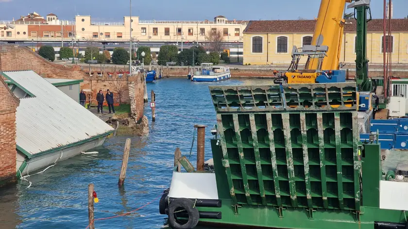 Crollo alla questura di Venezia, una maxi gru al lavoro per recuperare il container finito in acqua