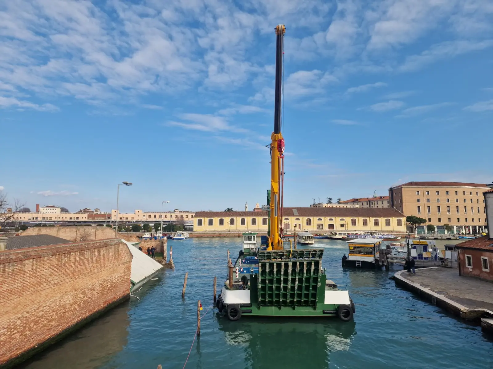 Dalla mattina di lunedì 2 febbraio, una maxi gru posizionata sopra una chiatta, sta cercando di tirare su dall'acqua il container della Polizia di Stato scivolato nel canale della Scomenzera, che in questo momento si trova in bilico. Per ora, però, senza alcun successo.