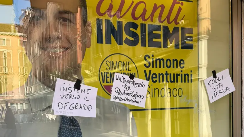 Atto vandalico nella notte ai danni della sede elettorale di Simone Venturini in Campo Santa Marina. Ignoti hanno imbrattato le vetrate con scritte offensive e minacce rivolte ai candidati e ai cittadini che sostengono la coalizione. In uno dei fogli, attaccati con lo scotch nero, anche la promessa: «Domani con la spray».