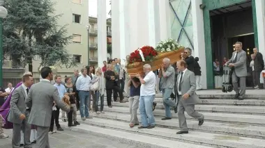 La bara di Renzo Mingardo (nel riquadro) portata fuori dalla chiesa