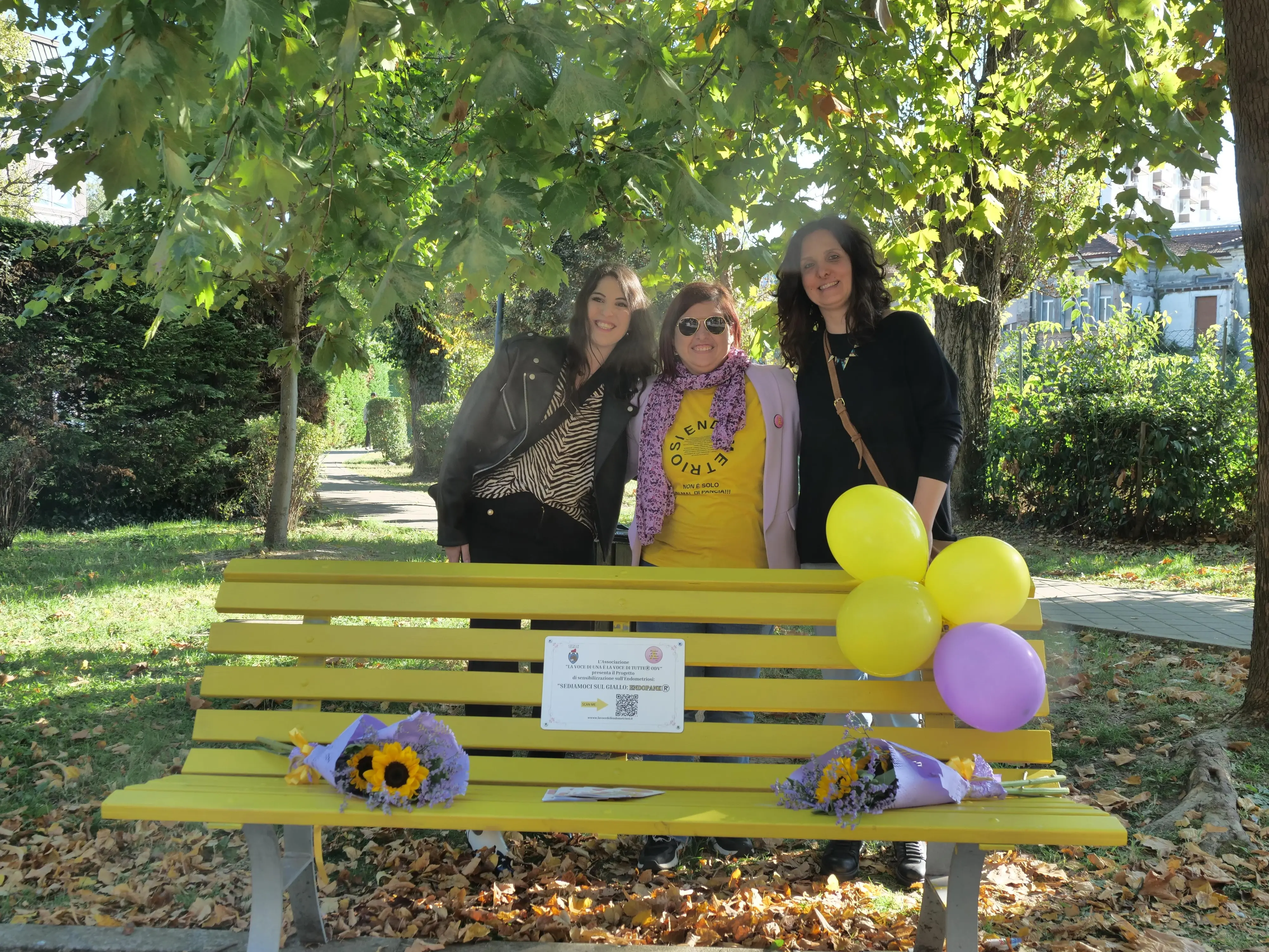 Al parco di via Einaudi sedute di colore lilla e giallo per parlare alla gente di fibromialgia ed endometriosi