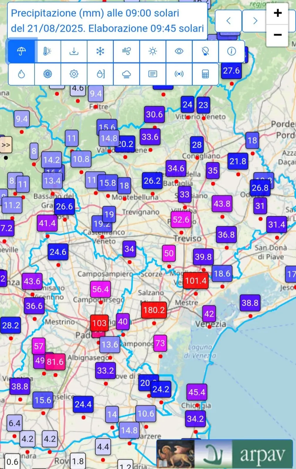 Dalla serata del 20 agosto, quando piogge diffuse hanno interessato la pianura centro-meridionale ed orientale, fino alle prime ore del 21 agosto si sono registrati fenomeni intensi: a titolo di esempio, a Montegalda (Vicenza) sono caduti circa 32 mm di pioggia, con rovesci fino a 30 mm/h, mentre a Mira (Venezia) le precipitazioni hanno raggiunto picchi di 80 mm/h.