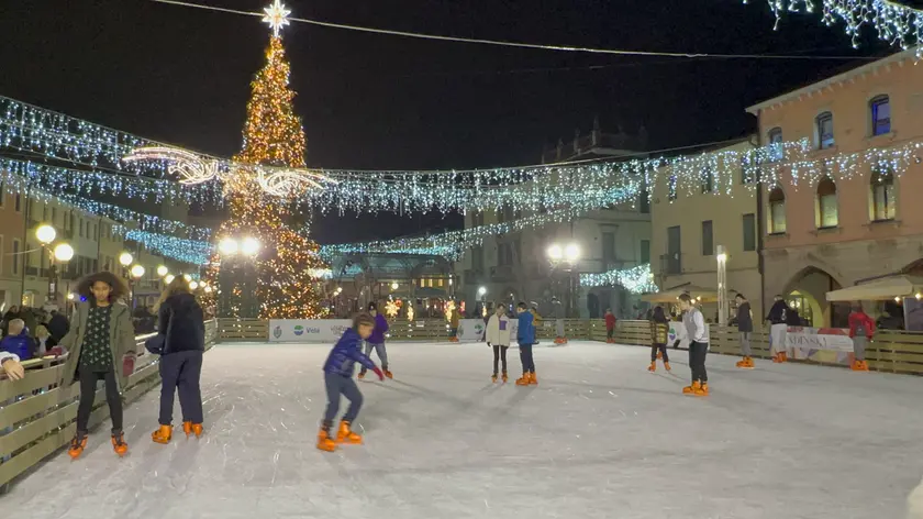 L’episodio in piazza Ferretto. La guardia giurata stava sorvegliando la pista di pattinaggio sul ghiaccio quando è stato aggredito. Per lui venti giorni di prognosi. I due hanno anche danneggiato tavoli e sedie di alcuni locali