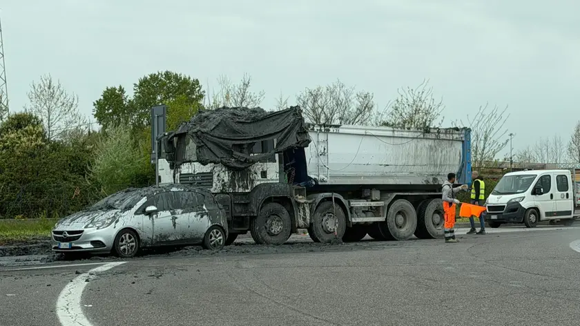 La brusca frenata avrebbe fatto spostare chili di terra in avanti, rompendo anche parte del telo di protezione. La terra è finita in parte sull’asfalto, in parte sull’auto che viaggiava davanti al camion.