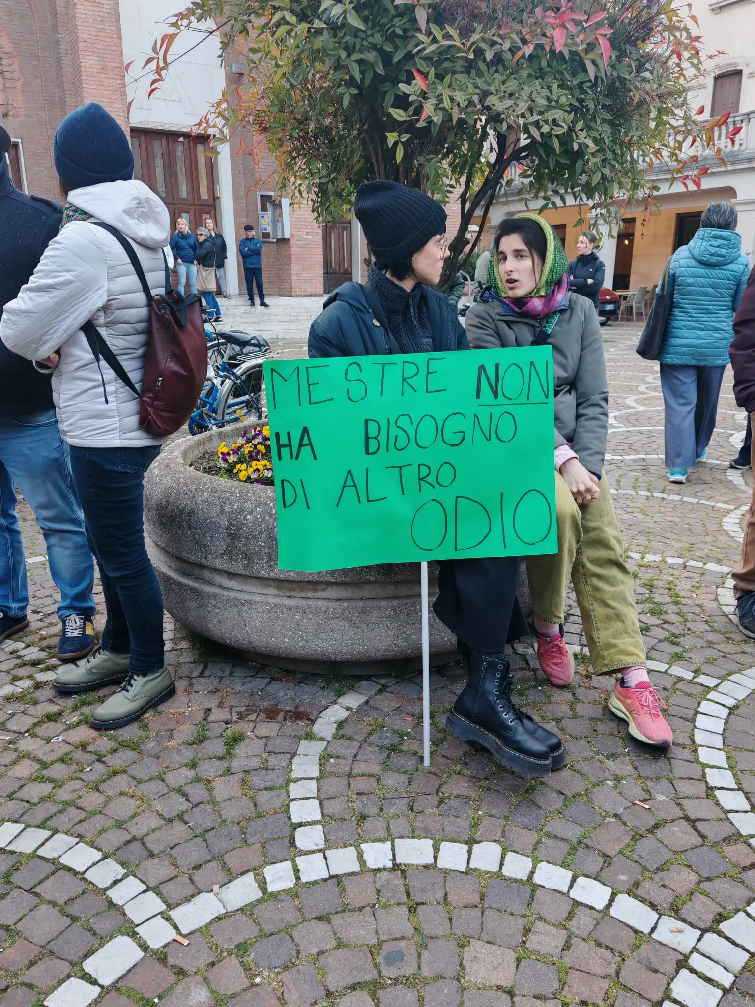 Alle 21 i militanti, dopo essere arrivati in auto da mezzo Veneto, aprono le bandiere nere nel piazzale della stazione. «La gravità è che anche la destra va a caccia del voto degli stranieri, Fd’I voleva candidare un bengalese in cambio dei voti” dice Castellini, “noi siamo contro la presenza musulmana in Italia. Non vogliamo che Mestre diventi islamizzata. Il messaggio è che la destra di governo e la sinistra sono uguali, la società multietnica è un fallimento “