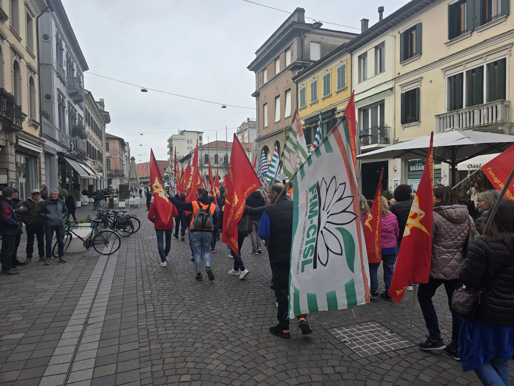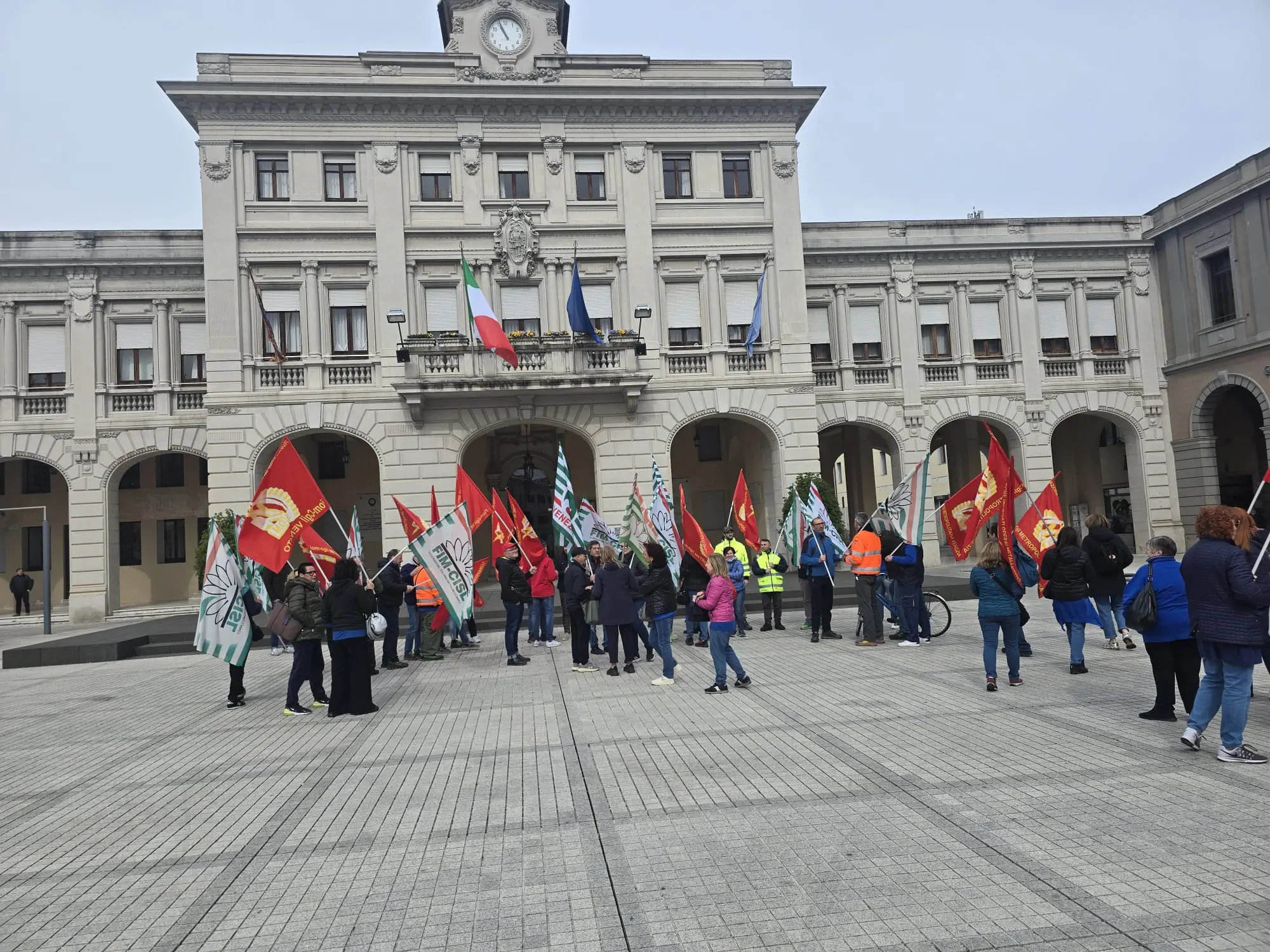 Lavoratori e lavoratrici della Peg Perego davanti al municipio di San Donà per protestare contro lo spostamento della linea produttiva ad Arcore.