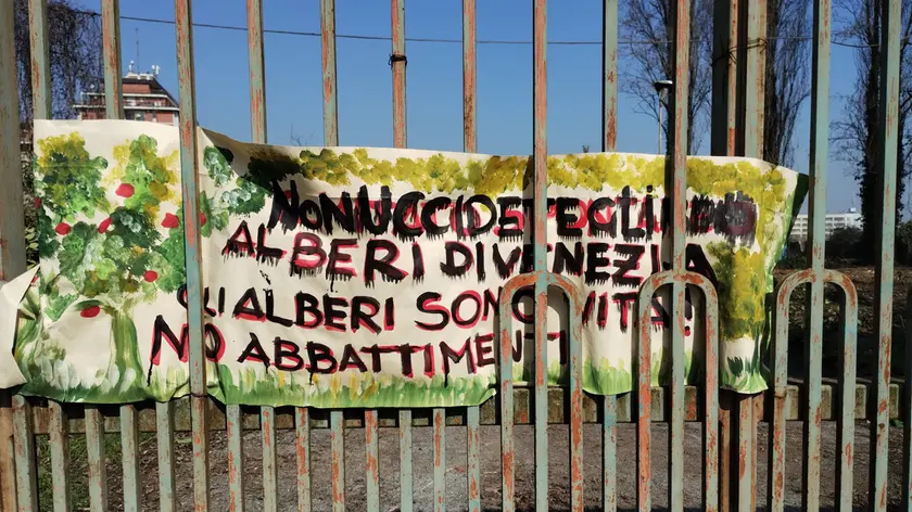 Oggi, lunedì 9 marzo, dalle 7 di mattina è scattata la ostruzione nonviolenta di comitati e cittadini contro il taglio degli ultimi pioppi rimasti nell’ex segheria di via Paolucci a Marghera. Un gruppo di abitanti con Amico Albero, Marghera Oggi e ViviAmo Marghera, hanno vigilato l’area esponendo striscioni e chiedendo agli operai del consorzio Zorzetto di fermarsi. «Tre altissimi li hanno abbattuti, ma alle 9.30 siamo riusciti a far arrivare la polizia forestale metropolitana e dopo mezz'ora si è raggiunto l'accordo di salvare gli ultimi otto, che sono vicini alle case. Non una vittoria, ma meglio di niente», racconta Michele Boato di Amico Albero.