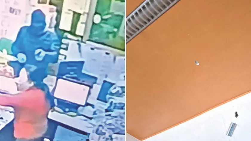 A sinistra la tentata rapina avvenuta venerdì sera al tabacchino sulla statale 14 a Musile di Piave. A destra il foro sul soffitto causato dal proiettile