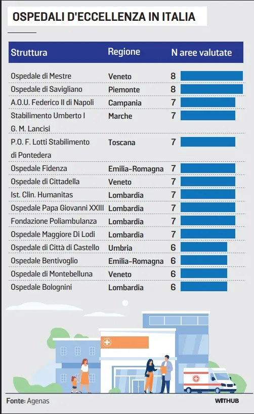 In vetta alla classifica dei migliori ospedali d’Italia sale l’ospedale dell’Angelo di Mestre. A certificarlo è il Programma nazionale esiti dell’Agenzia nazionale per i servizi sanitari regionali (Agenas) che ha analizzato e valutato le performance di 1. 117 strutture pubbliche e private, individuando 15 realtà al top. Tre sono venete.