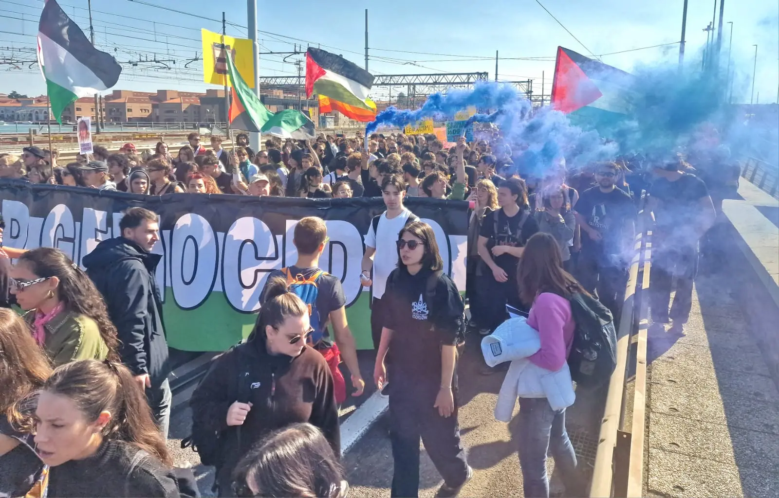 Mobilitazione per Gaza con i cortei da campo Santa Margherita e dalla stazione ferroviaria di Mestre verso il ponte. Disagi nei trasporti, manifestanti sul tetto del Garage comunale a piazzale Roma