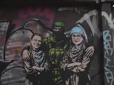 A Milano un murale ritrae Greta Thunberg e Francesca Albanese abbracciate da un miliziano di Hamas