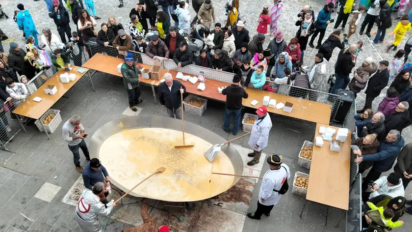 (ANSA) - TRIESTE, 16 FEB - A Muggia, in provincia di Trieste, si è rinnovata oggi la tradizione della frittatona, appuntamento fisso nell'ambito delle seguitissime iniziative per il carnevale. In un'enorme padella, posizionata nella principale piazza cittadina, anche stavolta sono stati sistemati 35 chili di salsiccia e più di 2mila uova. L'appuntamento è diventato nel tempo uno spettacolo nello spettacolo, che attira un pubblico numeroso, attento a non distrarsi durante tutte le fasi della cottura. A fine preparazione le porzioni di frittata sono state distribuite gratuitamente alle persone festanti presenti. L'iniziativa è organizzata dall'Associazione delle Compagnie del Carnevale, in collaborazione con la gastronomia Il Cuoco, offerta da Confartigianato Trieste. La 72/a edizione del Carnevale di Muggia continuerà domani con gli ultimi appuntamenti in calendario, tra i quali le premiazioni delle maschere e dei gruppi protagonisti della sfilata di ieri, dove le otto compagnie del Carnevale si sono date battaglia a colpi di carri allegorici, costumi, coreografie e musica, con una partecipazione complessiva, nella parata, di oltre 2mila maschere. La manifestazione si concluderà mercoledì con i tradizionali funerali del Carnevale. (ANSA).