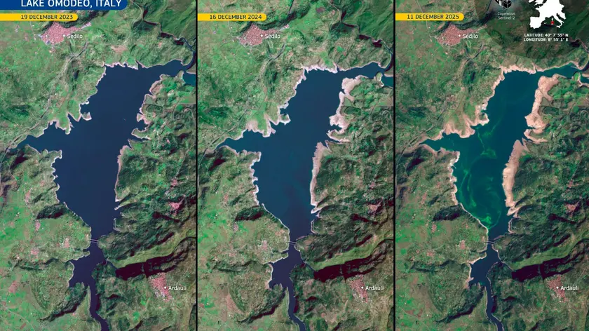 (ANSA) - CAGLIARI, 15 DIC - La siccità che sta colpendo la Sardegna in tre immagini simbolo: le acqua del Lago Omodeo che si sono progressivamente ritirate. Le tre foto del più grande bacino artificiale della Sardegna centrale arrivano dal satellite CopernicusEU Sentinel-2 che le ha acquisite il 19 dicembre 2023, il 16 dicembre 2024 e l'11 dicembre 2025. "Le fasce chiare che circondano la linea di costa indicano livelli d'acqua in calo, riflettendo un netto calo del volume immagazzinato - spiegano gli scienziati - Secondo le autorità locali, lo stoccaggio è diminuito da 349,04 milioni di mü a fine novembre 2023 (83,30% della capacità totale) a 256,71 milioni di mü a fine novembre 2024 (61,27%) e a 187,44 milioni di mü a fine novembre 2025 (44,74%) I dati di Copernicus Sentinel-2 supportano il monitoraggio costante dei livelli idrici dei bacini nel tempo e la gestione a lungo termine delle risorse idriche". Complessivamente, nell'ultima rilevazione dell'autorità di Bacino della Sardegna relativa al 30 novembre scorso, nei bacini artificiali dell'Isola è presente solo il 35% della capacità invasabile, ossia 638,34 milioni di metri cubi, in calo dell'1% rispetto ai dati di fine ottobre ma otto punti percentuali in meno rispetto a novembre 2024. Nonostante le recenti piogge, resta la situazione di emergenza idrica in Baronia (nel Nuorese) e nel Sulcis, ma anche gli altri territori non sorridono, dalla Gallura e Sassarese, all'Oristanese e sud Sardegna. L'unica situazione non critica si rileva in Ogliastra. (ANSA).