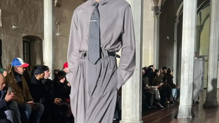 (di Beatrice Campani) (ANSA) - ROMA, 15 GEN - "Sono trascorsi quindici anni da quando ho provato per ben quattro volte a partecipare a un concorso di moda in Italia, che alla fine non ho mai vinto. In quel momento ho pensato che le cupe atmosfere del Giappone mal si adattassero a un cielo luminoso come quello italiano, e ho messo da parte l'idea. Adesso, oltre un decennio più tardi, è per me un grande onore poter sfilare a Firenze". A parlare è lo stilista giapponese Soshi Otsuki, classe 1990, ospite speciale di Pitti Uomo 109 con una sfilata, andata in scena questo pomeriggio al refettorio di Santa Maria Novella. Da quindici anni a questa parte c'è però stata un'evoluzione stilistica, non si può definire certamente cupo il suo tailoring maschile, semmai nostalgico. La collezione Autunno/Inverno 2026 del marchio che porta il suo nome, Soshiotsuki, fondato nel 2021 e premiato nel 2025 con l'Lvmh prize per i giovani designers, si concentra sulla manipolazione dei dettagli sartoriali e sul rapporto che questi creano con il corpo. Il percorso creativo parte da una domanda che lo stilista si è posto: perché proviamo un senso di nostalgia per epoche che non abbiamo mai vissuto? Dunque Otsuki, che ha frequentato il Bunka fashion college ma non ha avuto una formazione specifica nel tailoring, ha voluto fare un omaggio all'Italia, definita "la patria spirituale della sartoria", per reinterpretare i classici del guardaroba uomo attraverso una lente personale. Sono tanti i riferimenti a tecniche del passato, ritenute preziose, ma anche allo stile classico da uomo con eleganti e classici completi dal fit abbondante, tipicamente anni Ottanta. Il riferimento è agli anni del 'baburu keiki' (la bolla economica giapponese di metà anni '80), quando a Tokyo gli uomini vestivano Armani, vestivano italiano. Ma il designer giapponese ha voluto aggiungere qualche dettaglio speciale. I revers a lancia e le punte dei colletti delle camicie vengono arricciati artificialmente grazie alla tecnica della lavorazione del ferro, introducendo un sottile senso di movimento in strutture altrimenti statiche. Le precise camicie Oxford sono costruite in sbieco, enfatizzando intenzionalmente il drappeggio che appare quando si infila il capo nei pantaloni. La camicia bianca è cucita al pantalone, trasformando l'ensemble in una tuta. Sempre impeccabile la costruzione dei capi, evocando proprio quella precisione sartoriale tipica degli abiti della moda italiana anni Ottanta. In questa stagione lo stilista ha anche voluto esplorare la sartorialità attraverso molteplici collaborazioni, tra cui quella con Asics Sportstyle, per alcuni capi da abbinare ai look (tra cui la felpa in velluto). Quello di Otsuki è un Made in Japan filtrato dal concetto di Made in Italy, che però viene ispirato dalle classiche arti performative del Giappone, tradotte in moda grazie alle tecniche sartoriali e artigianali, ponendo massima cura nei minimi dettagli. (ANSA).