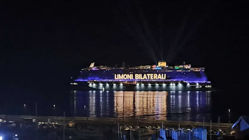 (ANSA) - SANREMO, 27 FEB - La nave Costa Toscana al largo di Sanremo tra poco sarà in collegamento con il festival per un medley di canzoni di Max Pezzali. Sul fianco campeggia la scritta 'limoni bilaterali' in onore dei 'festini bilaterali' di Elettra Lamborghini. (ANSA).