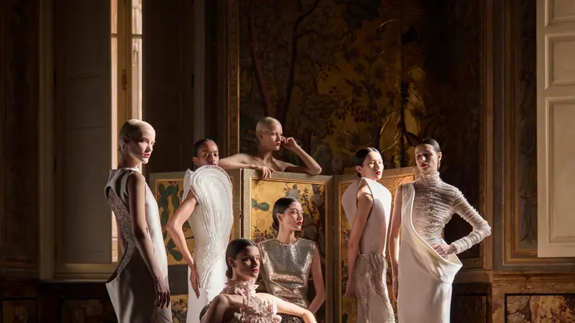 (di Patrizia Vacalebri) (ANSA) - ROMA, 26 GEN - Arte e alto artigianato convivono nella nuova bella collezione di alta moda di Antonio Grimaldi, il bravo couturier campano adottato da Roma, che dopo qualche anno di sfilate a Parigi, ha deciso di tornare a presentare le sue preziose collezioni di haute couture nella capitale. Il momento per le sfilate non è dei migliori. Per questo Grimaldi ha optato per una presentazione statica nel salotto cinese dell'antico palazzo, sede del suo atelier. Il mondo della moda è ancora in lutto per la perdita di Valentino Garavani, l'ultimo imperatore della moda, emblema dei grandi couturier italiani del Novecento, che hanno contribuito a costruire la fama del made in Italy nel mondo, come eccellenza. Nonostante la grave perdita, come tutti abbiamo imparato anche in altre occasioni simili, com'è accaduto lo scorso anno con la morte di Giorgio Armani, the show must go one. Inoltre, considerando, che, nonostante le disquisizioni in tv e sui social, non è affatto vero che l'alta moda non ha più nulla da offrire, non ha mercato, ed è finita un'epoca, perché se ancora esistono talenti della moda che sanno valorizzare la femminilità ed esaltarne la bellezza, come lo è Antonio Grimaldi, "il sogno" di possedere un abito sartoriale che possa renderci uniche continuerà. La nuova collezione di Antonio Grimaldi nasce come una storia di intima complicità. Un racconto potente e trattenuto, che vive nella tensione del non detto e nella profondità dei legami invisibili. La collezione si configura come una storia d'amore che non si racconta ma si percepisce, dove la natura delle donne si rivela intimamente alleata con l'arte. Nel cuore segreto di un palazzo romano, dove l'oro si fa silenzio e la pittura diventa linguaggio delle pareti, Antonio Grimaldi sceglie il Salotto Cinese di Palazzo Besso come ispirazione e scenario della collezione. Uno scrigno raro e quasi nascosto, rivestito da grandi pannelli dipinti di ispirazione orientale, popolati da fiori e uccelli sospesi su fondi dorati, che accoglie l'alta moda come un'estensione naturale del suo immaginario. Non è una scelta casuale. Palazzo Besso è anche la sede dell'atelier Grimaldi: uno spazio vissuto, abitato quotidianamente dalla creazione. La connessione tra collezione e luogo nasce dall'interno, come un'ispirazione maturata nel tempo, sedimentata tra le mura che accolgono la tradizione dell'alta moda. Gli abiti diventano superfici narrative. Ricami floreali, che rimandano ai preziosi arredi in legno intagliato di manifattura thailandese presenti nel salotto, emergono in una tridimensionalità scultorea attraverso foglie in rafia e organza. Duchesse e crêpe cady costruiscono la forma, chiffon e tulle la rendono impalpabile, mentre cannette a rilievo che fuoriescono dall'abito, creando profondità e movimenti sensuali. "I materiali definiscono un equilibrio tra rigore e leggerezza: gli abiti puliti esaltano la silhouette lasciando poi spazio a ricami preziosi che sembrano posarsi direttamente sul corpo, un'ode alla sensualità femminile" racconta lo stilista. Frange di rafia che sfiorano il suolo, cascate di cristallo che catturano la luce, volant scultorei come petali accompagnano la silhouette. Kaftani in rafia e nude look impreziositi con ricami di perle in legno e cristalli dall'eco etnico si alternano con corazze metalliche a microscaglie, in un gioco di elegante geometria, evocando una femminilità guerriera, indipendente e consapevole. (ANSA).
