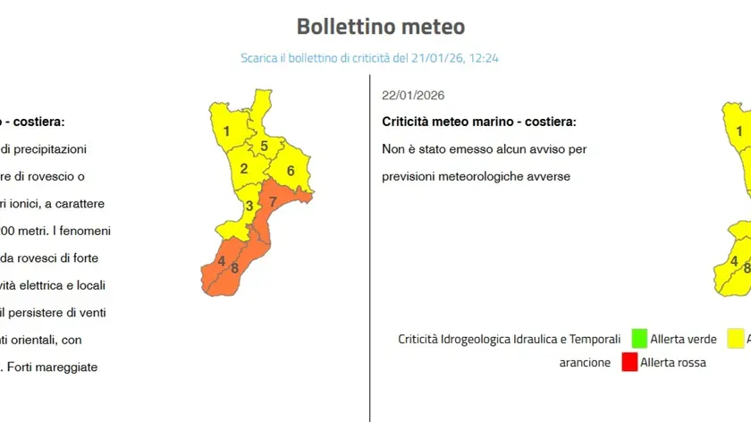 (ANSA) - CATANZARO, 21 GEN - L'allerta meteo sulle zone ioniche del Catanzarese e su quelle ioniche e tirreniche del Reggino è scesa, per la giornata di oggi, ad arancione. E' quanto evidenzia l'ultimo bollettino della Protezione civile. La situazione meteorologica appare in miglioramento. Domani, infatti, è previsto un ulteriore declassamento con allerta gialla su tutta la Calabria. (ANSA).