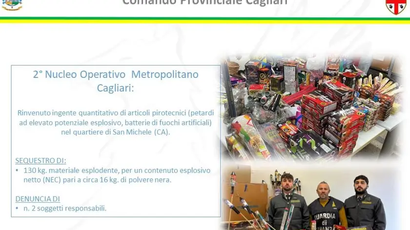 (ANSA) - CAGLIARI, 31 DIC - Petardi ad elevato potenziale esplosivo, batterie di fuochi artificiali, oltre a ulteriori ordigni, tra cui manufatti artigianali e dispositivi privi della marcatura CE, tutti destinati alla vendita. Li hanno trovati i finanzieri del 2/o Nucleo Operativo Metropolitano di Cagliari, all'interno di una piazza del quartiere San Michele dove due venditori abusivi avevano piazzato due distinte bancarelle nella stessa area, Le successive perquisizioni domiciliari hanno consentito di rinvenire altro materiale che è stato sequestrato: complessivamente 130 kg di fuochi, per un contenuto esplosivo netto pari a circa 16 kg di polvere nera. I due venditori ambulanti sono stati denunciati per commercio abusivo di materie esplodenti, per non aver adottato idonee misure di sicurezza nello stoccaggio del materiale detenuto. Inoltre sono state contestate loro violazioni amministrative per l'esercizio abusivo di attività commerciale. "L'operazione si inserisce nel più ampio dispositivo di prevenzione e contrasto predisposto dalla Guardia di finanza a tutela della salute e della sicurezza collettiva, volto a reprimere la commercializzazione di prodotti pericolosi, anche quando potenzialmente leciti, ma detenuti e posti in vendita in violazione delle specifiche disposizioni di legge", spiegano dalla Gdf di Cagliari che, in questo fine anno, ha intensificato i controlli sulla vendita illegale di fuochi d'artificio. (ANSA).