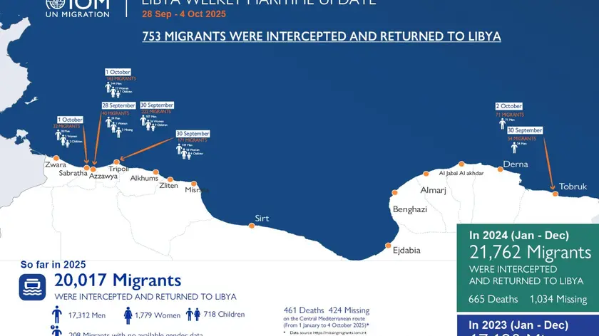 - TUNISI, 07 OTT - Almeno 461 persone sono morte e 424 risultano disperse sulla rotta del Mediterraneo centrale dall'inizio dell'anno al 4 ottobre. Lo rende noto l'Organizzazione internazionale per le migrazioni (Oim) in Libia nel suo ultimo aggiornamento pubblicato su X. Nello stesso periodo, precisa l'agenzia dell'Onu, i migranti intercettati in mare e riportati in Libia sono stati 20.017, di cui 17.313 uomini, 1.779 donne, 718 minori e 208 di cui non si conoscono i dati di genere.