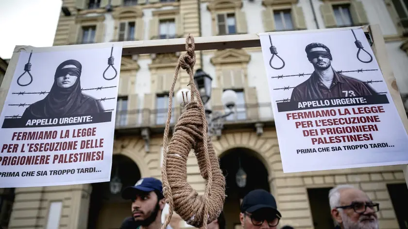 - TORINO, 10 APR - Presidio pro Palestina nel pomeriggio in piazza Castello a Torino, dove circa 400 persone si sono date appuntamento per manifestare contro la guerra e a sostegno del popolo palestinese. Un'iniziativa che vede tra gli organizzatori la rete 'Torino per Gaza' In piazza bandiere della Palestina, ma anche di Rifondazione comunista, del collettivo studentesco Cambiare Rotta, dei Collettivi Autorganizzato universitari e di Sinistra anti capitalista , oltre a striscioni e cartelli. 'Criminale è chi sostiene il genocidio. Contro le aggressioni di Usa e Israele', si legge in uno striscione, 'No alla pena di morte. Gloria alla Resistenza', in un altro. Alcuni manifestanti hanno messo in scena una performance: otto persone vestite da detenuti, con catene e cappi al collo, a rappresentare i prigionieri palestinesi condannati a morte. Con i volti sporchi di sangue. Due bandiere degli Stati Uniti sono state posizionate a terra. Nel corso dell'iniziativa è stato lanciato un appello contro "l'approvazione della pena di morte per i palestinesi accusati di terrorismo", tema al centro degli interventi. "Abbiamo convocato questo momento per ritrovarci in piazza e protestare contro uno stato di guerra che si fa sempre più totale", spiegano gli organizzatori di Torino per Gaza. Tra gli slogan più scanditi 'Free Palestine' e 'Libertà'.
