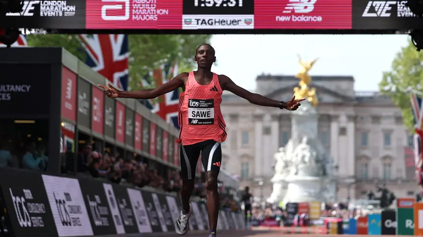 (ANSA) - ROMA, 26 APR - Sabastian Sawe abbatte per la prima volta in una gara ufficiale lo storico muro delle due ore nella maratona. L'atleta keniota ha trionfato a Londra chiudendo con il nuovo record del mondo in 1h59'30. (ANSA).