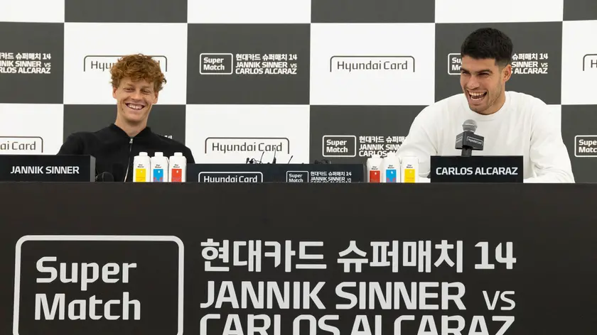 Risate, cori e applausi: show in campo a Seul per Sinner-Alcaraz