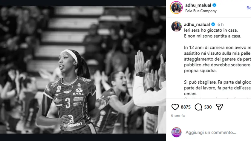 (ANSA) - ROMA, 21 DIC - "Ieri sera ho giocato in casa. E non mi sono sentita a casa". Comincia così il post su Instagram con il quale la schiacciatrice di Monviso Volley (Pinerolo) Adhu Malual ha voluto denunciare l'atteggiamento di una parte dei propri tifosi che, nel corso della partita contro Macerata, le avrebbero rivolto pesanti insulti di matrice razzista, non risparmiando anche i suoi familiari presenti sulle tribune. "In 12 anni di carriera non avevo mai assistito né vissuto sulla mia pelle un atteggiamento del genere da parte del pubblico che dovrebbe sostenere la propria squadra" ha scritto la giocatrice azzurra, nata da genitori sudanesi, ma italiana. "Insulti, fischi costanti, offese personali e sì commenti razzisti, rivolti non solo a me ma anche ai miei familiari sugli spalti. Dal primo punto all'ultimo. Non per spronare. Non per sostenere. Solo per colpire", é la sua denuncia. Nonostante ciò "sono fiera di essere italiana. Sono fiera di giocare in uno dei campionati più forti al mondo. Sono fiera di indossare la maglia azzurra, perché l'amore che provo per questo Paese, che è la mia casa, è indescrivibile. E non permetterò a nessuno di metterlo in discussione". "Io continuerò a fare il mio lavoro. Con dignità. Con professionalità. Con rispetto per questo sport - conclude Malual -. Ma una cosa va detta chiaramente: il silenzio, davanti a certi comportamenti, non è più un'opzione". (ANSA).