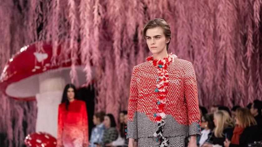 (di Beatrice Campani) (ANSA) - PARIGI, 27 GEN - Tessuti leggerissimi, trasparenze, piume e un tocco di anni Venti. Debutto in un mondo fiabesco per la prima collezione di haute couture disegnata da Matthieu Blazy per Chanel, presentata stamani a Parigi durante la settimana dell'alta moda per la primavera/estate 2026. Allestito con un set che tanto ricorda un bosco delle favole, decorato con enormi funghi in tutte le sfumature del rosa e salici piangenti dalle foglie rosa pastello, il Grand Palais ha accolto una parata di star, tra cui Penelope Cruz, Nicole Kidman e Dua Lipa. Lo stilista franco-belga, dal 2025 nuovo direttore artistico della maison della doppia C, ha puntato sulla leggerezza dei materiali, i tessuti impalpabili, le trasparenze e i colori pastello, facendo però l'occhiolino agli anni Venti per le silhouette degli abiti. Moltissimi, infatti, i look decorati con bordi piumati, frange e paillettes, accompagnati da ricami complessi e applicazioni preziose. Con queste lavorazioni lo stilista ha voluto portare l'attenzione sul grande savoir faire artigianale di Chanel, come d'altra parte aveva già anticipato alcuni giorni prima dello show con tre immagini postate sui social network della maison che mostravano mani intente a ricamare un tessuto con ago e filo, proprio a mostrare il focus della collezione. Sulla passerella è forte il tema del bosco incantato e della natura, che viene ripreso nei ricami, come i bordi degli abiti ricchi di piume colorate come code di pavoni, gli spolverini decorati con rouches che ricordano le piante rampicanti, i tubini ricamati con fiocchi di organza e tulle come fosse il piumaggio di un uccello. Senza scordare il nuovo vezzo stilistico, le calzature con il tacco a forma di funghetto, che già si preannuncia uno dei dettagli più amati dalle fan della maison francese. Non manca l'iconico tailleur di Chanel, anche qui decorato sui bordi delle maniche e sul colletto con raffinatissime piccole piume tono su tono. Blazy con la sua prima collezione nell'alta moda ha voluto celebrare l'anima della maison, nascondendo qua e la anche i codici di stile della casa di moda fondata da Coco Chanel, come il tweed, il bouclé, i fiori di camelia, che appaiono nei dettagli di tutta la collezione. In passerella c'è tutto il mondo di Chanel, ma interpretato secondo un chiaro pensiero: ogni look deve essere leggero, impalpabile, a volte anche trasparente. Anche i colori sono molto importanti in questo percorso di Blazy, scelti in maniera strategica partendo dalle delicate tonalità pastello dei rosa, azzurri e nude che tanto vanno di moda in questo momento, interrotte da flash in toni accesi come rosso o arancione. Un contrasto, questo, voluto anche nell'abbinamento dei materiali, come ad esempio nel mix di chiffon e cotoni pesanti. L'idea del mix tra leggerezza e materiali strutturati è chiara soprattutto nei look più iconici, come quello che prevede il classico blazer in tweed abbinato alla gonna in chiffon trasparente. L'idea di leggerezza è chiara anche nel look finale che chiude lo show, un completo con camicia e gonna oversize in delicate paillettes bianche. (ANSA).