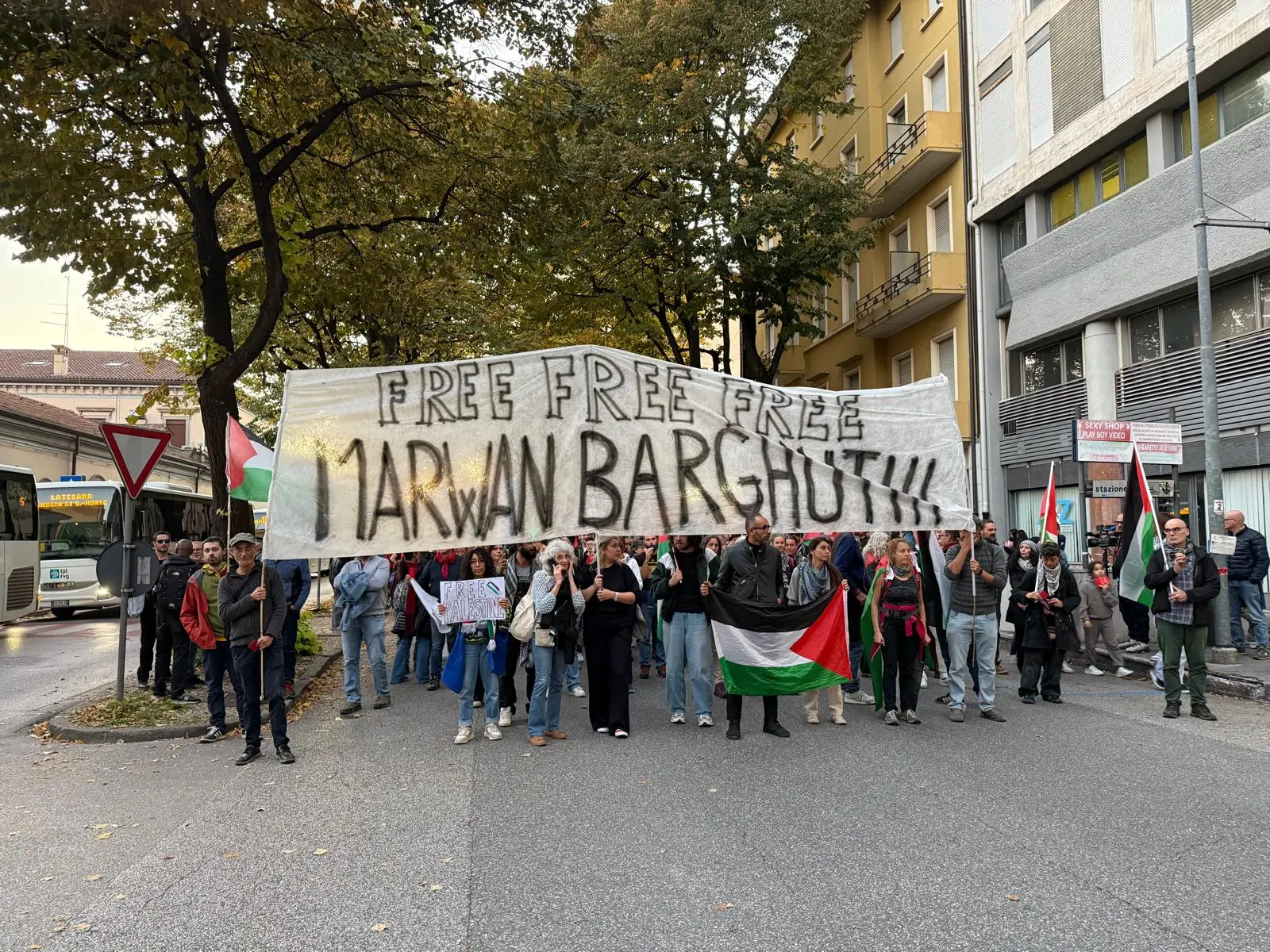 Nella prima parte del corteo campeggia un maxi striscione a favore di Marwan Barghouti, leader politico di Al-Fatah e considerato uno dei simboli della resistenza palestinese, detenuto in Israele dal 2004 a causa di una condanna a diversi ergastoli per terrorismo