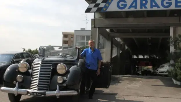 Mario Ruoso con un'auto d'epoca nel suo Garage Venezia