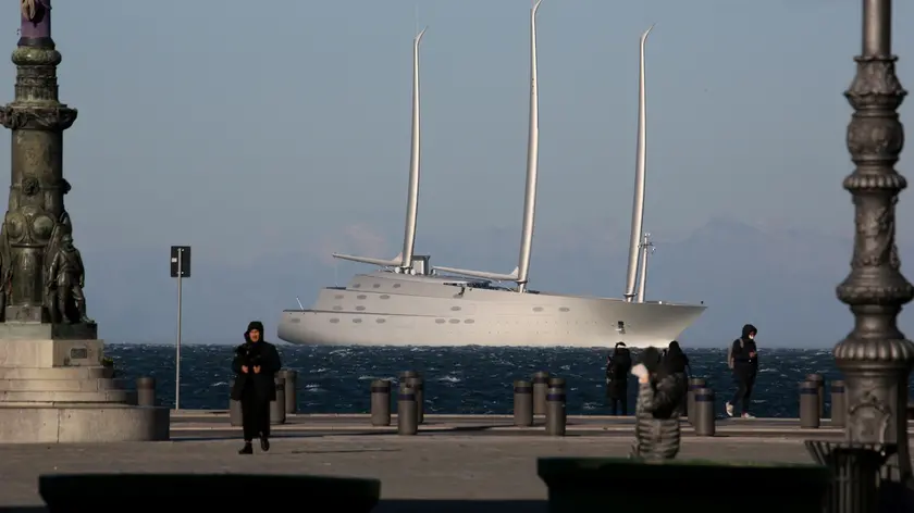 Lo yacht A immortalato davanti a piazza Unità in una giornata di bora Foto Andrea Lasorte