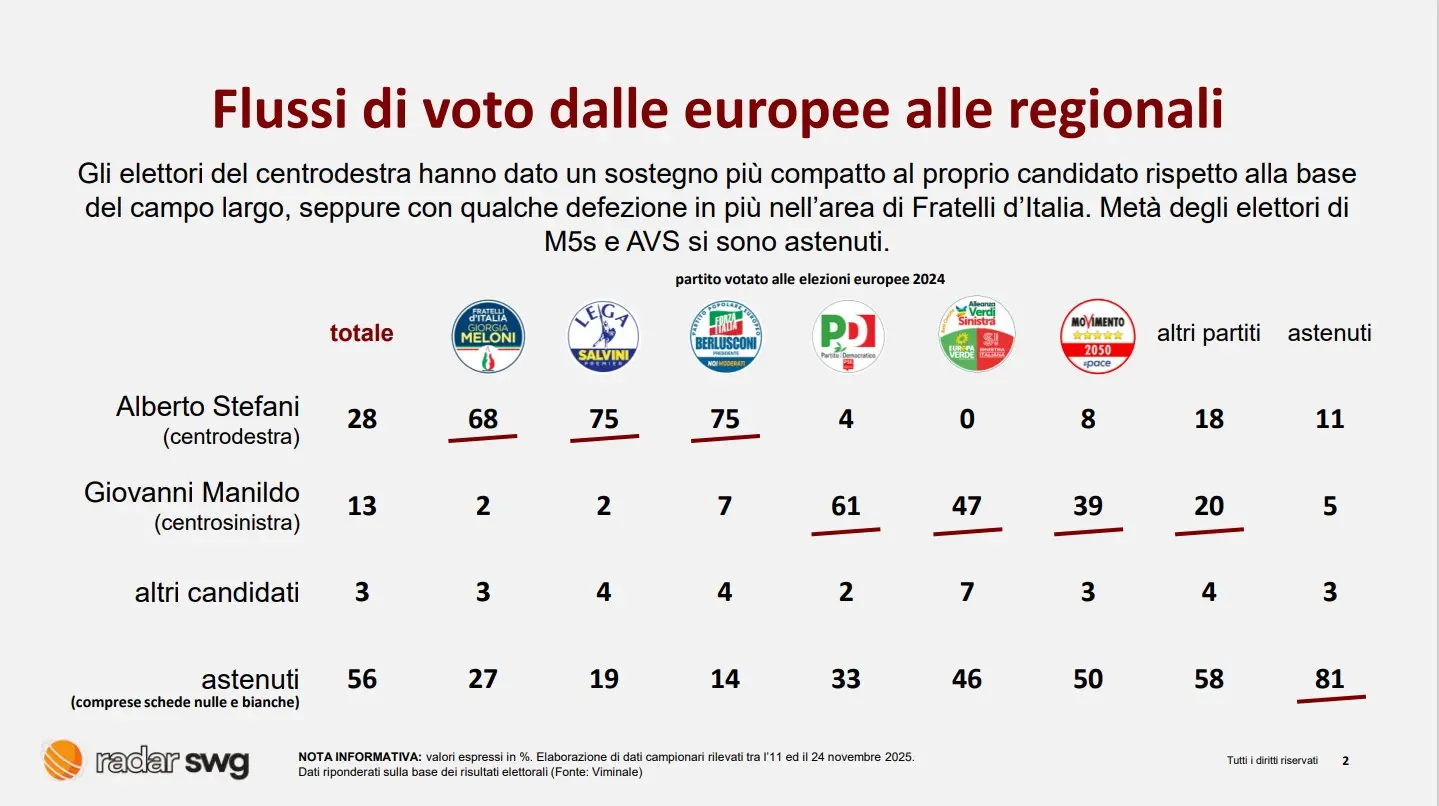 L’analisi è stata condotta sulla base di sondaggi effettuati tra l’11 e il 24 novembre 2025. Dati poi riponderati sulla base dei risultati elettorali (Fonte: Viminale).