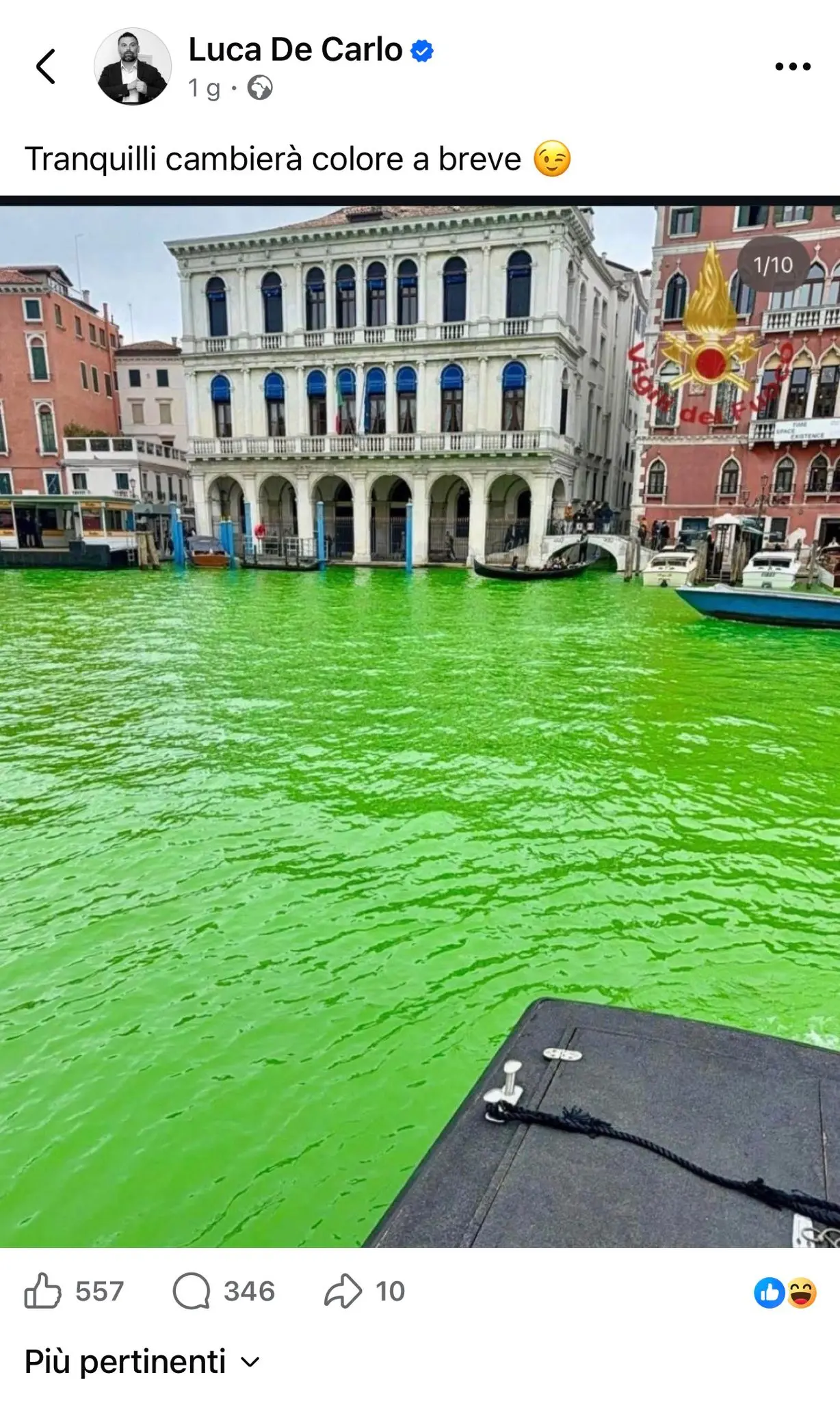 Tornando al derby: sabato scorso, Luca De Carlo aveva pubblicato sulla sua pagina facebook un vero e proprio guanto della sfida, anzi una autentica spacconata: profittando del blitz ambientalista a Venezia, con le acque verdi in zona Rialto, aveva giocato sul sorpasso dei Fratelli verso il Carroccio.