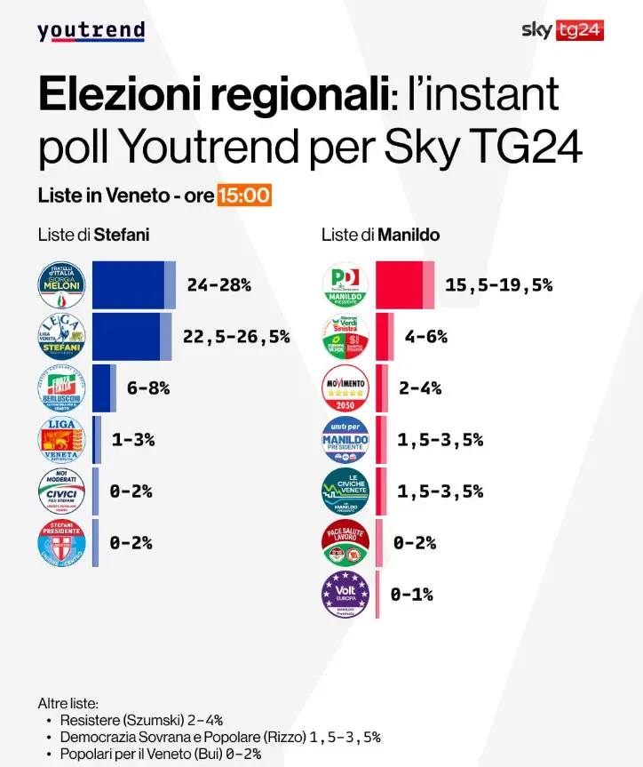 Nel nuovo Instant Poll delle 15:00 realizzato da YouTrend per Sky TG24, il candidato del centrodestra Alberto Stefani risulta nettamente avanti, con una stima compresa tra il 59% e il 63%. Il candidato del campo progressista, Giovanni Manildo, sostenuto da centrosinistra e M5S, viene indicato tra il 30,5% e il 34,5%. Anche questa rilevazione conferma quindi un vantaggio molto ampio per Stefani nella corsa alle Regionali del Veneto.