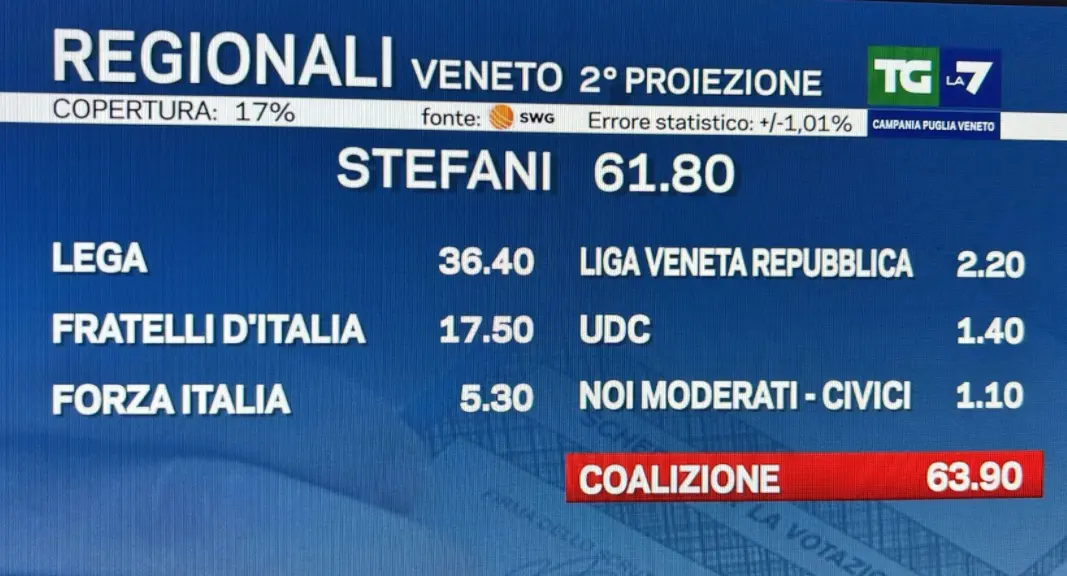 La prima proiezione Swg per le Regionali in Veneto, con una copertura dell’11%, indica un quadro molto definito. Il candidato del centrodestra Alberto Stefani è stimato al 62,5%, mentre il candidato del centrosinistra Giovanni Manildo si attesta al 31,1%.