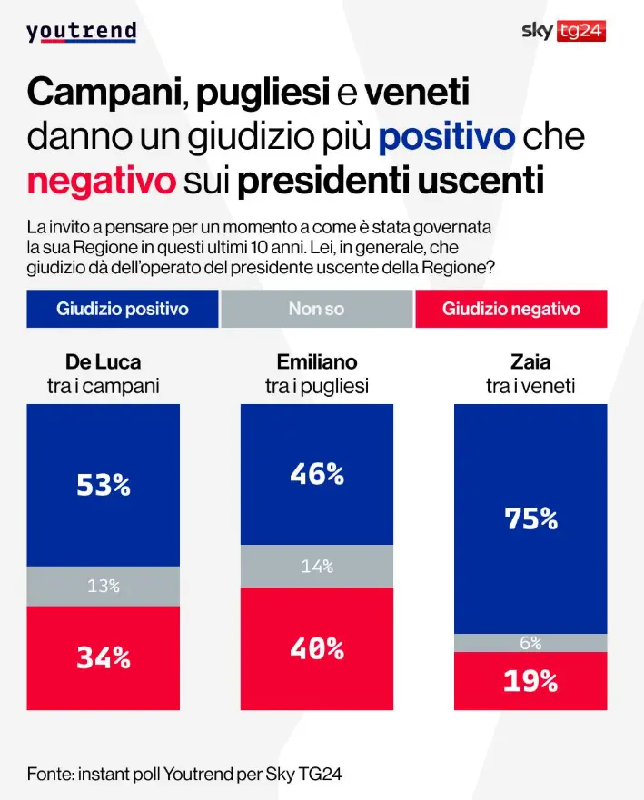 Secondo l’instant poll YouTrend per Sky TG24, in tutte e tre le regioni al voto prevale un giudizio positivo sull’operato dei presidenti uscenti. In Campania, Vincenzo De Luca ottiene il 53% di valutazioni positive, contro il 34% di giudizi negativi. In Puglia, Michele Emiliano raccoglie il 46% di apprezzamenti, mentre il 40% esprime un giudizio negativo.
