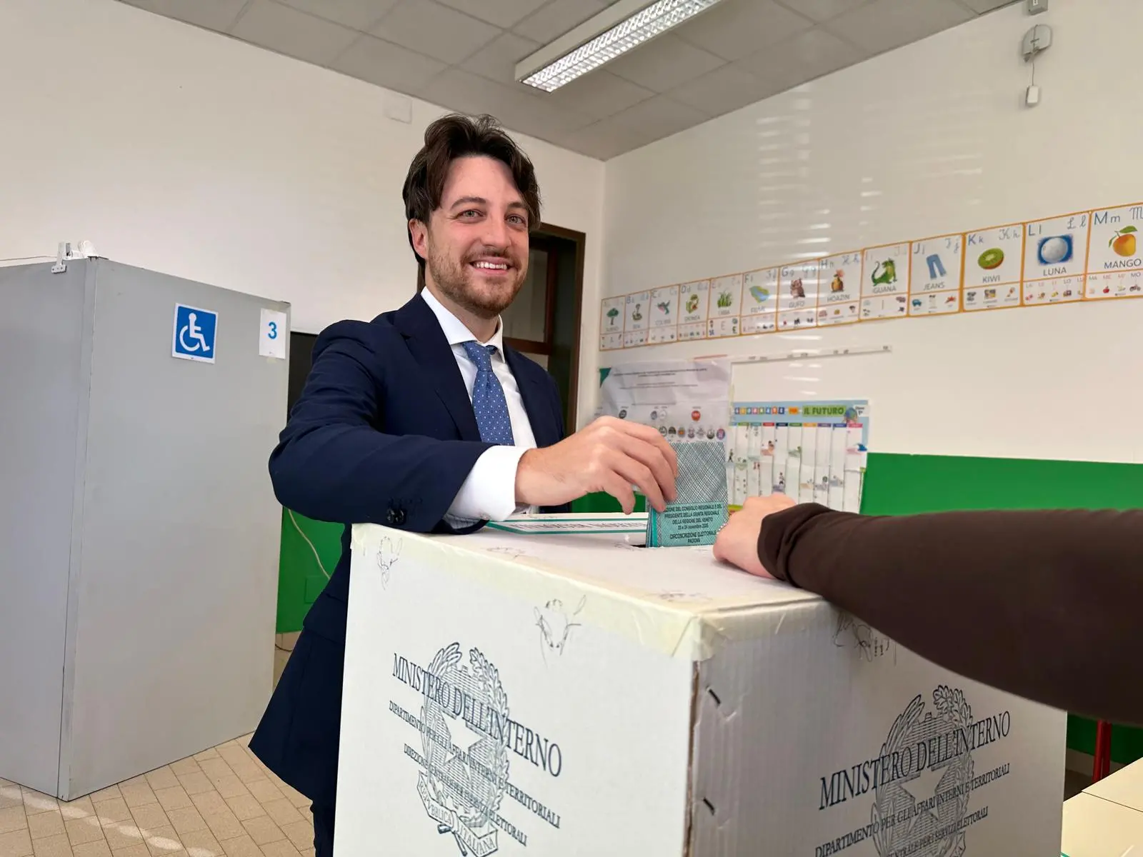 Il candidato del centrodestra Alberto Stefani ha votato attorno alle 11 nella scuola primaria Locatelli di Borgoricco, il paese dell’Alta Padovana di cui è stato anche sindaco
