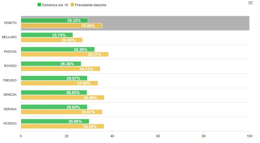 - Qui la tabella che riporta la percentuale di votanti in Veneto alle ore 19 (dati Eligendo)