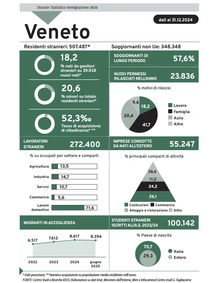 Il Veneto si conferma una delle principali regioni italiane per presenza di cittadini stranieri, ma i dati dell’ultimo Dossier Statistico Immigrazione 2025, realizzato dal Centro di studi e ricerche Idos, mostrano un quadro di rallentamento nella crescita demografica, accompagnato però da segnali positivi sul fronte occupazionale, imprenditoriale e dell’integrazione scolastica. Su tutto, colpisce la continua crescita dell'imprenditoria "immigrata", che incide per il 12% sul tessuto regionale.