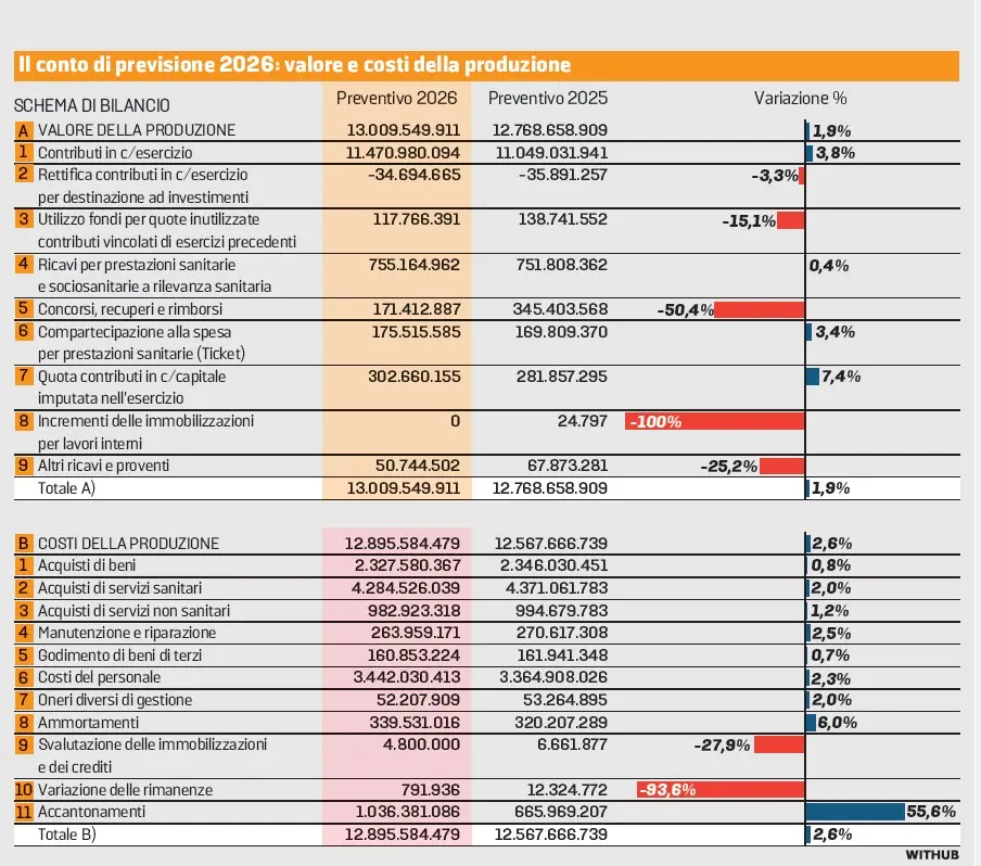 Lo dice il bilancio economico preventivo consolidato 2026 pubblicato da Azienda Zero che ha raccolto i previsionali dei presidi veneti e che è stato adottato dalla giunta regionale. Va fatta una premessa: si tratta del preventivo per cui i numeri sono suscettibili di modifiche che risentono di diversi fattori: gli obiettivi assegnati dalla giunta ai singoli dg, le linee di indirizzo di Azienda Zero in base alla Commissione consiliare, l’evoluzione dei vincoli di costo e dell’inflazione.