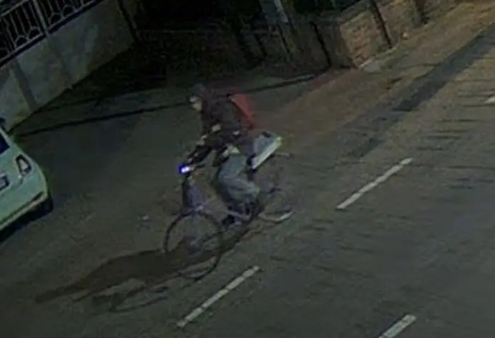 La ragazza indossa un paio di jeans e una giacca nera col cappuccio. Sul portapacchi della bici ci sono i due cartoni delle pizze prese da asporto intorno alle 22.00.