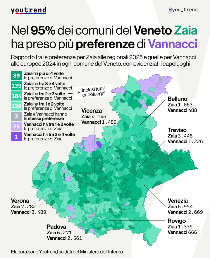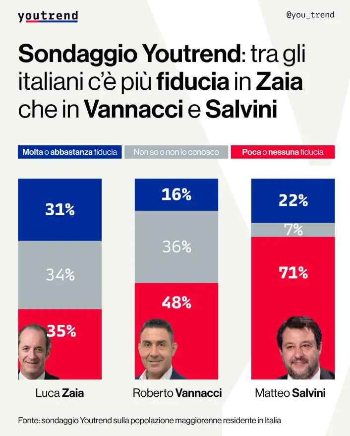 In particolare, su Zaia ha molta o abbastanza fiducia il 31% del campione, poca o nessuna fiducia il 35%, non sa o non conosce il 34%; Matteo Salvini riscuote molta o abbastanza fiducia nel 22%, poca o nessuna nel 71%; non sa o non conosce il 7%. Su Roberto Vannacci c'è molta o abbastanza fiducia nel 16%, poca o nessuna nel 48%; non sa o non conosce il 36%.