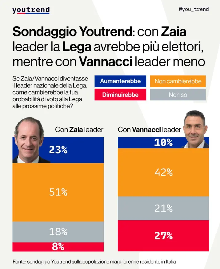 Se Zaia diventasse il leader nazionale della Lega, la probabilità di voto alla Lega alle prossime politiche aumenterebbe per il 23% del campione, diminuirebbe per l'8% e non cambierebbe per il 51%. Incerto il 18%. Se il leader del Carroccio fosse Vannacci, il voto alla Lega aumenterebbe per il 10%, diminuirebbe per il 27% e non cambierebbe 42%; non sa il 21%.